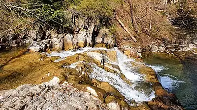 За 850 метрів нижче на цьому ж потоці, в самому його гирлі, розташований водоспад Розтока нижній.