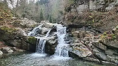 Загальна висота перепаду води 3,5—4 м, ширина водоспаду бл. 5 м, кількість каскадів — 2. Водоспад утворився в місці, де річка перетинає скельний масив пластового типу, утворений стійкими до ерозії пісковиками. Водоспад «затиснений» прямовисними, масивними скелями, які в цьому місці утворюють каньйон потоку Розтока.