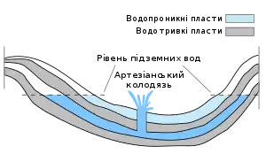 Геологія артезіанських вод. Показані водотривкі та обводнені пласти.