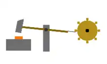Водяний молот приводився в дію валом з кулачками, що урухомлювався водяним колесом. Бойок молота для міцності виконувався із заліза[4]. Залежно від способу зчеплення молота з приводом розрізняють хвостові, середньобійні і чолові молоти.