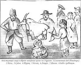 | «На роги кози іноді чіпляли дзвоник і уквітчували їх кольоровими стрічками».[15] |