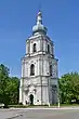 Дзвіниця вирішена у стилі українського бароко[7] з певним впливом класицизму. Цегляна, тинькована, в плані наближається до квадрата з увігнутими сторонами, триярусна, завершена куполом. Перший ярус із арковим отвором, рустований. Яруси увінчують розкреповані карнизи. Будівлю прикрашають колони і пілястри (у другому ярусі іонічні, у третьому — коринфські).