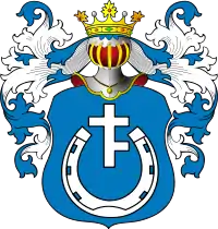 У блакитному полі п'ятикутний хрест, супроводжуваний знизу підковою (Ср. Прус).
