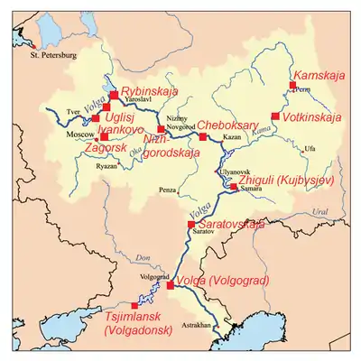 - Чебоксарська ГЕС (Чебоксарське водосховище (2.274 км², 13,8 км³))