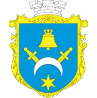 Герб: у синьому полі щита срібний півмісяць ріжками вниз, у нього встромлено зверху два золоті мечі, вгорі — золотий дзвін, внизу золота 6-променева зірка; щит увінчує срібна міська корона.
