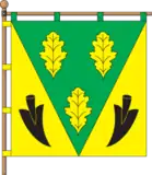 На квадратному жовтому полотнищі від верхніх кутів до середини нижньої сторони виходить зелений клин, супроводжуваний по сторонам двома чорними ралами. На клині три жовтих дубових листки, два і один.