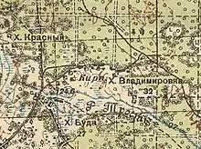 Згідно з мапою РСЧА 1941 року на сучасній території села розміщувалися 2 хутори: Буда (південний схід та центр) і Володимирівка (північний схід); на північ від сучасної території села знаходився хутір Червоний (рос. Красный).[3] Згодом хутори перетворилися на села Червоне (хутір Буда) та Володимирівка. Хутір Червоний припинив своє існування.