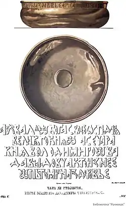 Під час розкопок на місці столиці Золотої Орди Сарай-Берке знайшли чашу чернігівського князя Володимира Давидовича. Вздовж вінця цього чудового виробу середини XII століття по кругу вибито напис: «А се чара князя Володимирова Давидовча. Кто із нєє п'є, тому на здоровьє, а хваля Бога своєго осподаря великого князя»[1]. Цей напис на чарі є пам'яткою української мови[2].