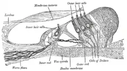 ![]() Кортіїв орган: зовнішні волоскові клітини знаходяться зверху, внутрішні — у центрі | |