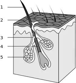 Росте волосся з фолікулів. Волосина складається з ороговілої частини, або стрижня, який піднімається над шкірою, та кореня, який схований у волосяний мішечок — цибулину.