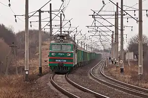 ![]() Вантажний поїзд проїжджає повз зупинний пункт. | |