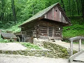 Давній сільський водяний млин, датований 1880-ми роками, перенесено до скансену міста Сянік.