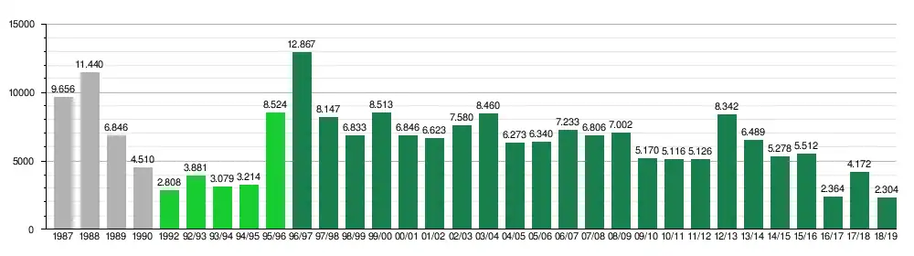 | Сезон | Ліга | Місце | Ігор | В | Н | П | М'ячі | Очок |
