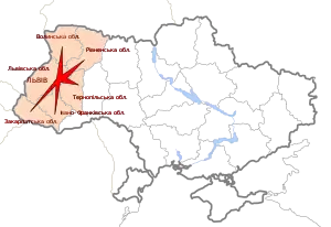 Волинська область, Закарпатська область, Івано-Франківська область, Львівська область, Рівненська область, Тернопільська область[1] |