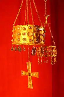 Вотивна корона — була винаходом візантійців, перейнятим вестготами та лангобардамі. Являла собою корону-обруч, яка підвішувалася зі стелі церкви над вівтарем або в арках.