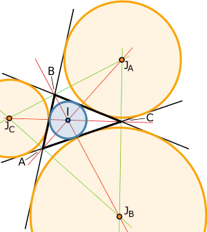 Трикутник (чорний) з вписаним колом (синє), зовнішніми вписаними колами (помаранчеві), бісектрисами внутрішніх (червоні) та зовнішніх (зелені) кутів.
