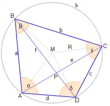 Площа K вписаного чотирикутника зі сторонами a, b, c, d обчислюється за формулою Брахмагупти[5]