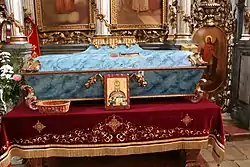 Праворуч від вівтаря знаходиться кипарисова труна з мощами святого Лазаря Сербського. Цей саркофаг встановлений у 1826 році. Мощі князя Лазаря, перевезені у Врднік ченцями з Раваниці у 1690 році неодноразово переносились з монастиря в інші місця: у 1716 році через небезпеку бути захопленими турками їх деякий час тримали у Футозі, потім у 1848, побоюючись угорців ченці перенесли мощі до Кленака, але вони залишилися там лише три місяці, а потім повернулися до Врдніка. На початку Другої світової війни вони знову були перенесені з Врдніка, цього разу до Бешенівського монастиря, де вони знаходилися в період з 1941 до 1942 року, а згодом звідти вони були переправлені у Белград. 14 квітня 1942 року професор Богословського факультету протоієрей Радослав Груїч переніс мощі Лазаря в Белградський кафедральний собор. І лише під час святкування 600-річчя битви на Косовому полі у 1989 році вони були повернуті в Раваницю. Тим не менше, в монастирі є частка мощей (ключиця), яка експонується в скляній ємності, вбудованій в труну.