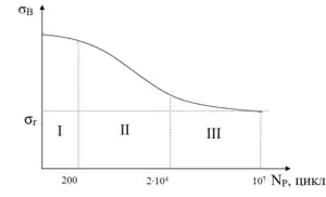 При випробуванні деяких матеріалів, зокрема вуглецевих сталей за кімнатної температури, права ділянка залежності прямує до горизонтальної лінії (Nр > 107 циклів).