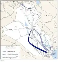 Наступ проводився трьома угрупуванням: 3-тя піхотна дивізія США рухалася на захід і далі на північ на Багдад через пустелю; 1-й експедиційний корпус морської піхоти просувався через центр країни на північний захід по автомагістралі Басра-Багдад; 1-ша британська моторизована дивізія рухалася в межиріччі Тигру та Євфрату також у бік Багдада. 22 березня передові британські частини з ходу зайняли нафтові вишки в декількох кілометрах на північний захід від Басри.