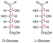 Усі моносахариди, крім дигідроксиацетону, містять хіральні атоми карбону, тобто такі, до яких приєднано 4 різні замісники, через це можливе утворення стереоізомерів, кількість яких рівна 2n, де n — кількість хіральних атомів. Так, для гліцеральдегіду існує два таких ізомери (21), що є точними дзеркальними відображеннями одне одного (енантіомерами) — d-гілцеральдегід і l-гліцеральдегід. Альдогексози мають 4 хіральні центри, і, відповідно, 16 стереозомерів. У восьми з них положення гідроксильної групи біля найдальшого від альдегідної групи атома карбону відповідає такому у d-гліцеральдегіду, вони є d-ізомерами, решта 8 — l-ізомерами. Більшість гексоз живих організмів належать до d-ряду. Моносахариди, що відрізняються положенням гідроксильної групи тільки біля одного атома карбону, називаються епімерами, наприклад глюкоза й галактоза (відмінність біля C4)[3].