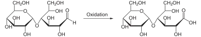 Залежно від здатності відновлювати слабкі окисники, такі як Cu2+, оксиди деяких металів, олігосахариди поділяються на редукуючі (відновлюючі) і нередукуючі (невідновлюючі). Для проявлення відновлювальних властивостей вуглевод повинен мати хоча б одну напівацетальну (чи напівкетальну) гідроксильну групу і, відповідно, можливість переходу у лінійну форму. Через це олігосахариди, що утворюються внаслідок реакції між глікозидним гідроксилом одного моносахариду і неглікозидним — іншого, мають так званий редукуючий кінець (той, на якому розташований глікозидний гідроксил) і можуть проявляти відновні властивості. До редукуючих дисахаридів належать мальтоза і лактоза[11]. Наприклад, реакція окиснення мальтози: