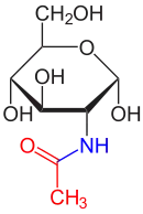 В аміноцукрів на аміногрупу заміщується одна з гідроксильних, найчастіше біля C2, як у глюкозаміну, галактозаміну й манозаміну. Майже завжди ця аміногрупа конденсується із оцтовою кислотою, як у N-ацетилглюкозаміну. Остання сполука входить до складу багатьох структурних полісахаридів, наприклад, у клітинній стінці бактерій. N-ацетилнейрамінова кислота є 9-карбоновим кислотним похідним N-ацетилманозаміну і є компонентом деяких гліколіпідів і глікопротеїнів у тварин[3].