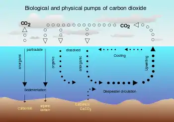 Цей процес є зворотним, що призводить до утворення вапнякових та інших карбонатних порід з вивільненням половини гідрокарбонатів у вигляді CO2. Впродовж сотень мільйонів років цей процес призвів до зв'язування в карбонатних породах здебільшого первісного діоксиду вуглецю з протоатмосфери Землі. У кінцевому підсумку більшість CO2, отриманого в результаті антропогенної емісії, буде розчинено в океані, але швидкість, з якою буде відбуватися цей процес у майбутньому, залишається не до кінця визначеною.[39]