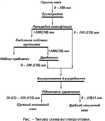 Вуглеприйом і складування рядового вугілля, що надходить на фабрику, здійснюється у вуглепідготовчих відділеннях. У типових схемах вуглепідготовчих відділень вуглезбагачувальних фабрик передбачається така послідовність операцій від вуглеприйому до передачі вугілля у головний корпус: вуглеприйом — попередня класифікація — виділення побічних предметів — дроблення — акумулювання в бункерах — усереднення і шихтування — передача вугілля у головний корпус, де відбувається його розділення на машинні класи.