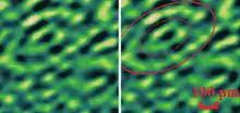 На фото надано пікоскопічне зображення двошарової нанотрубки[1] в розрізі, яке отримане шляхом денситометрії електронної хмарки (роздільна здатність 10 пікометрів). Внутрішню нанотрубку діаметром 240 пм складають шість атомів вуглецю, а зовнішню, діаметром 620 пм — складають 14 атомів. Атоми вуглецю мають жовтий колір. Окрім атомів на фото добре видно валентні зв'язки, вздовж площини це сильні сигма-зв'язки зеленого кольору. Внутрішня і зовнішня площини поєднуються між собою слабкими пі-зв'язками синього кольору.
