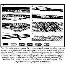 Вугільні пласти можуть бути простої і, частіше, складної, будови. Значно поширені вугільні пласти дуже складної будови, представлені багаторазовим чергуванням в їх розрізі шарів вугілля і породних прошарків. Контакти вугілля з ними можуть бути різкими або поступовими.