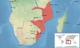 Мешкає у Демократичній Республіці Конго, Танзанії, Мозамбіку, Замбії, Зімбабве, Свазіленді, Малаві, Південно-Африканській республіці.