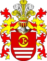 У червоному полі три золоті ріки[1] (чи три срібні бруси пол. trzy belki), візуально утворюють сходи: верхнє довше ніж нижнє і поступово зменшується додолу[1]. Над ними два золотих півмісяця (один звернений рогами додолу та інший кінцівками догори), що утворюють коло, а між ними є Мальтійський хрест, без правої частини поперечини[1]. На шоломі п'ять страусових пір'їн[1]. Спочатку цей символ був відомий в Угорщині[1].