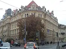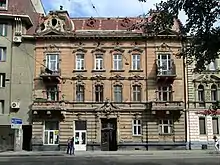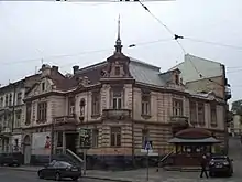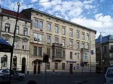 Житловий будинок (колишня адреса — вул. Панська, 9), що постав внаслідок перебудови у 1911–1912 роках триповерхової кам'яниці, збудованої у 1874 році. Перебудова у стилі раціональної сецесії з елементами неокласицизму здійснювалася за проєктами Владислава Рауха та Броніслава Бауера. Фасад завершує фронтон мансардного даху та чотирикутна вежа зі шпилем. Вхідні двері кам'яниці, зроблені у стилі ар деко. До війни у цій кам'яниці містився Львівський музичний інститут.