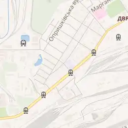 | Трамваї | Т 23, 33 (по Алматинській вулиці) |