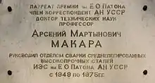 - буд. № 69 — меморіальна дошка на честь професора Арсенія Макари, який керував відділом у інституті ім. Є. О. Патона в 1949–1975 роках. Виготовлена з мармуру, відкрита в 1986 році.