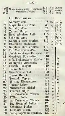 | польського періоду (польською) | Ormiańska wyższa (Obere Armenier Gasse), Universitetska (Universitäts Gasse), Ormiańska, Dzieduszyckich |