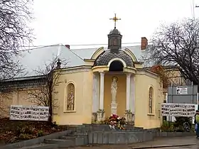 - Фігура Матері Божої на розі вулиць Галицької та Шевченка. Скульптура створена видатним митцем Іваном Самотосом[6]. На бічних стінах від фігури мозаїка образів митрополитів Івана Огієнка та Андрея Шептицького. Автор портретних мозаїк Анатолій Слободян[7].
