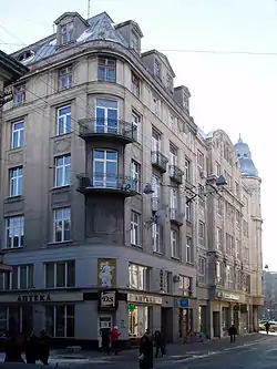 № 21. Будинок розі із вулицею Валовою (друга адреса — Валова, 7). Знаходиться на місці колишньої Галицької брами. У кінці XVIII століття, коли було розібрано міські фортифікації, тут було збудовано дві кам'яниці. 1907 року вже обидвома володів доктор Теодор Балабан, котрий на місці цих кам'яниць 1910 завершив спорудження нового будинку за проєктом Альфреда Захаревича та Юзефа Сосновського. 1931 року Вавжинець Дайчак провів реконструкцію приміщень першого поверху для Міської ощадної каси. Будинок наріжний, п'ятиповерховий. Кут акцентовано заокругленим еркером з вежею. Між вікнами другого поверху на обидвох фасадах розміщено по 4 рельєфи Зигмунта Курчинського. Будинок вважається одним із найкращих зразків модерну в архітектурі Львова.