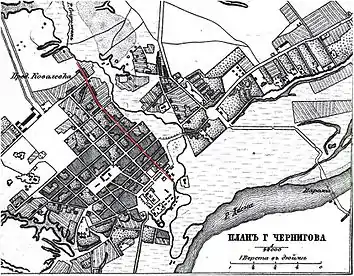 | Здається, ніби нещодавно (45 років) я почав пам'ятати Чернігів, у якому тоді було лише дві вулиці, зручні для проїзду двох зустрічних екіпажів: вулиці Олександрівська та Гонча.[2] Оригінальний текст (рос.) Кажется, будто бы недавно (45 лѣтъ) я началъ помнить Черниговъ, въ которомъ тогда только было двѣ улицы, удобныя для проѣзда двухъ повстрѣчавшихся экипажѣй: улица Александровская и Гончая. |
