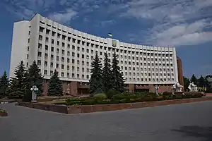 Перед Білим будинком за радянських часів було встановлено пам'ятник на честь приєднання Західної України до Радянської України. Біля стели встановили дві сидячі 3-метрові фігури, які зображають цимбаліста і кобзаря. Барельєф Леніна з 15-метрової стели зняли.