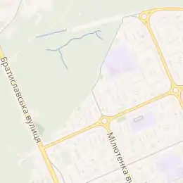 Прилучається вулиця Кубанської України, а вздовж лівої сторони — Биківнянський ліс (Биківня).