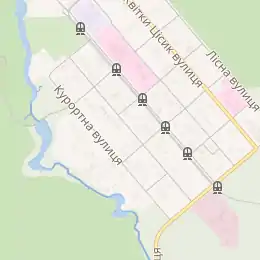 | Трамваї | Т 7, 12 (по вулиці Федора Максименка) |
