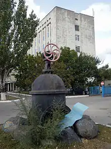 Біля українського театру височіє стела з тавтологічним надписом: «Борцям за комунізм, що боротьбу пізнали».