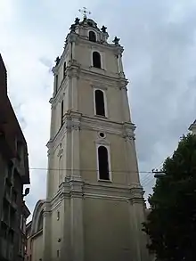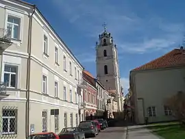 За дзвіницею стоїть останнім будівлю по лівій стороні вулиці — костел Святих Іоаннов, що виходить західним фасадом на вулицю Пілес (Šv. Jono g. 12 / Pilies g. 21). Майданчик між незбереженим будівлею кардиналів, в якому з середини XIX століття а працювала головна пошта, і костелом Святих Іоаннов називалася площею Петра Скарги або площею Святого Яна. У дзвіниці костелу в середині XIX століття був обладнаний фонтан. Будівля храму неодноразово відбудовувалося після пожеж і руйнувань та перебудовувалася. Сучасний вигляд воно отримало головним чином після реконструкції, проведеної архітектором Каролем Подчашінскій у 1827-1828 роках. На вулицю Швянто Йоно виходять каплиці Святої Варвари, Пясецький (Козьми та Даміана) та бічний вхід. Його виділяє прибудований Подчашінскій у 1827 році классицистский портал з портиком в чотири колони. У ніші сіней костелу стоїть статуя XVIII століття, зображає Ігнатія Лойолу, що зневажає сатану, що символізує перемогу єзуїтів над Реформацією.