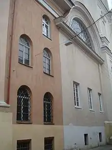 Примикає до будівлі аули пятиярусная дзвіниця костелу Святих Іоаннов — одне з найвищих будівель в Старому місті (63 метри; за іншими відомостями 68 метрів з хрестом[6]. Вона побудована в кінці XVI століття, кілька разів горіла, руйнувалася і заново відбудовувулась. Ворота, зазвичай замкнені, між дзвіницею та костелом Святих Іоаннов, ведуть в університетський Великий двір. Після Другої світової війни до кінця 1980-х років у цього входу висіла пам'ятна дошка, що написано було, що тут у першій віленській гімназії з 1887 до 1896 року навчався Дзержинський[7].
