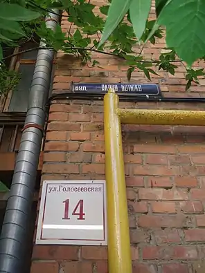 ![]() Старий вказівник вулиці Якова Батюка на будинку № 14 по сучасній Голосіївській вулиці Старий вказівник вулиці Якова Батюка на будинку № 14 по сучасній Голосіївській вулиці | |