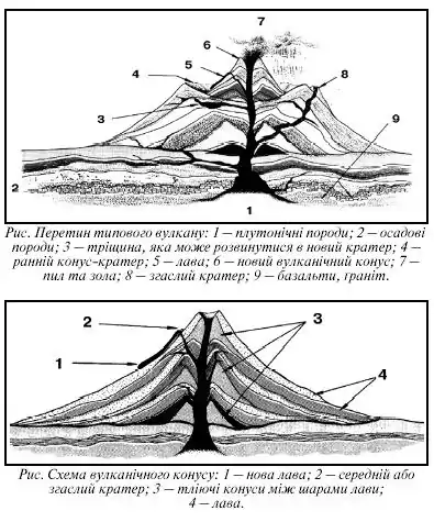 Вулкани можуть бути як поодинокими, так і ланцюгово витягнутими вздовж регіональних розломів. Вони розрізняються за розмірами, формою, параметрами кратера і підвідного каналу — жерла. Вулкан часто утворює конічну форму, що має назву вулканічний конус (рис.). Висота вулканічного конуса залежить від віку вулкана і характеру його вивержень. Як правило, чим старішим є вулкан, тим вищим є його конус, що складається із затверділих потоків лави і вулканічних уламків. Висоти конусів — від перших сотень до 8–9 тис. м (Везувій — 1186 м, Етна — 3522 м, Ключевська сопка — 4850 м та ін.). Найвищі вулкани знаходяться в Андах (Аконкагуа — 6960 м) та на Гавайських островах у Тихому океані (Мауна Лоа — 8766 м).