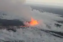 Після тритижневого періоду посиленої сейсмічної активності біля вулкану Фаградальсф'ядль на півострові Рейк'янес утворилася тріщина. Потік лави з 200-метрової тріщини був вперше виявлений вертольотом ісландської берегової охорони 19 березня 2021 року в районі [ ] поблизу Гріндавіка, і за кілька годин ця щілина виросла до 500 метрів у довжину.[16] Станом на 16 квітня 2021 довжина тріщини за оцінками може сягати 10 км, і зараз активними є 6 конусів, які утворились на тріщині.