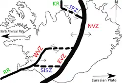 Голоценовий вулканізм в Ісландії в основному розташований у Неовулканічній зоні, що включає вулканічний пояс Рейк'янес (RVB), західну вулканічну зону (WVZ), середньо-ісландський пояс (MIB), східну вулканічну зону (EVZ) і північну вулканічну зону (NVZ). Два бічні вулканічні пояси відіграють другорядну роль: вулканічний пояс Ерефі (ÖVB) та вулканічний пояс Снефелснес (SVB).[1] За межами головного острова розташовані хребет Рейк'янес (RR), як частина Середнинно-Атлантичного хребта, на південний захід та хребет Кольбейнсі (KR) на північ. Дві зони трансформації з'єднують ці вулкано-тектонічні зони: Південно-Ісландська сейсмічна зона (SISZ) на півдні Ісландії та зона трансформації Тьорнеса (TFZ) на півночі.